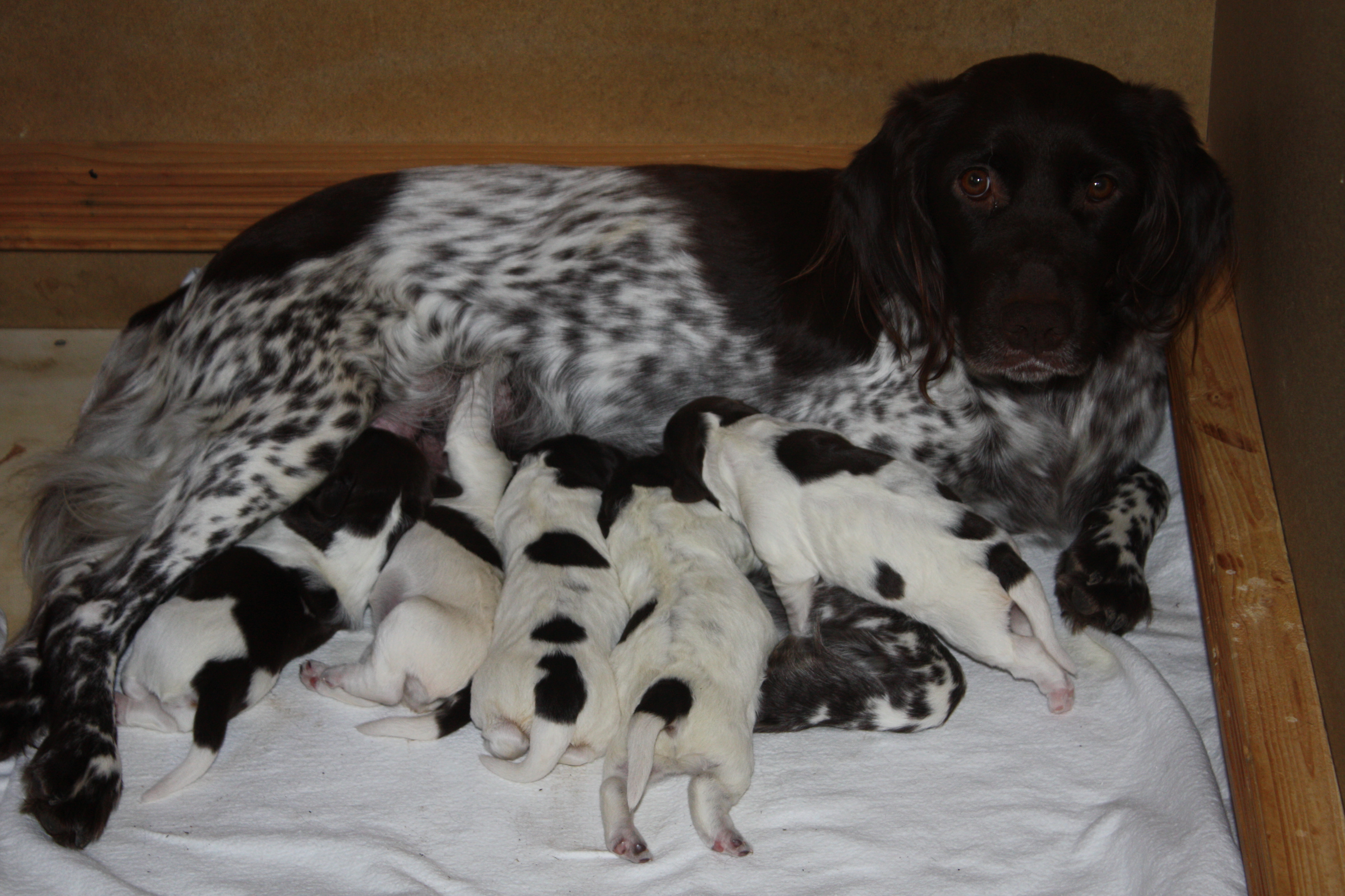 Unsere Hündin bekommt ihre Welpen im Jagdzimmer ihres „Herrchens“, wo schon Tage zuvor die Wurfkiste und andere notwendigen Utensilien